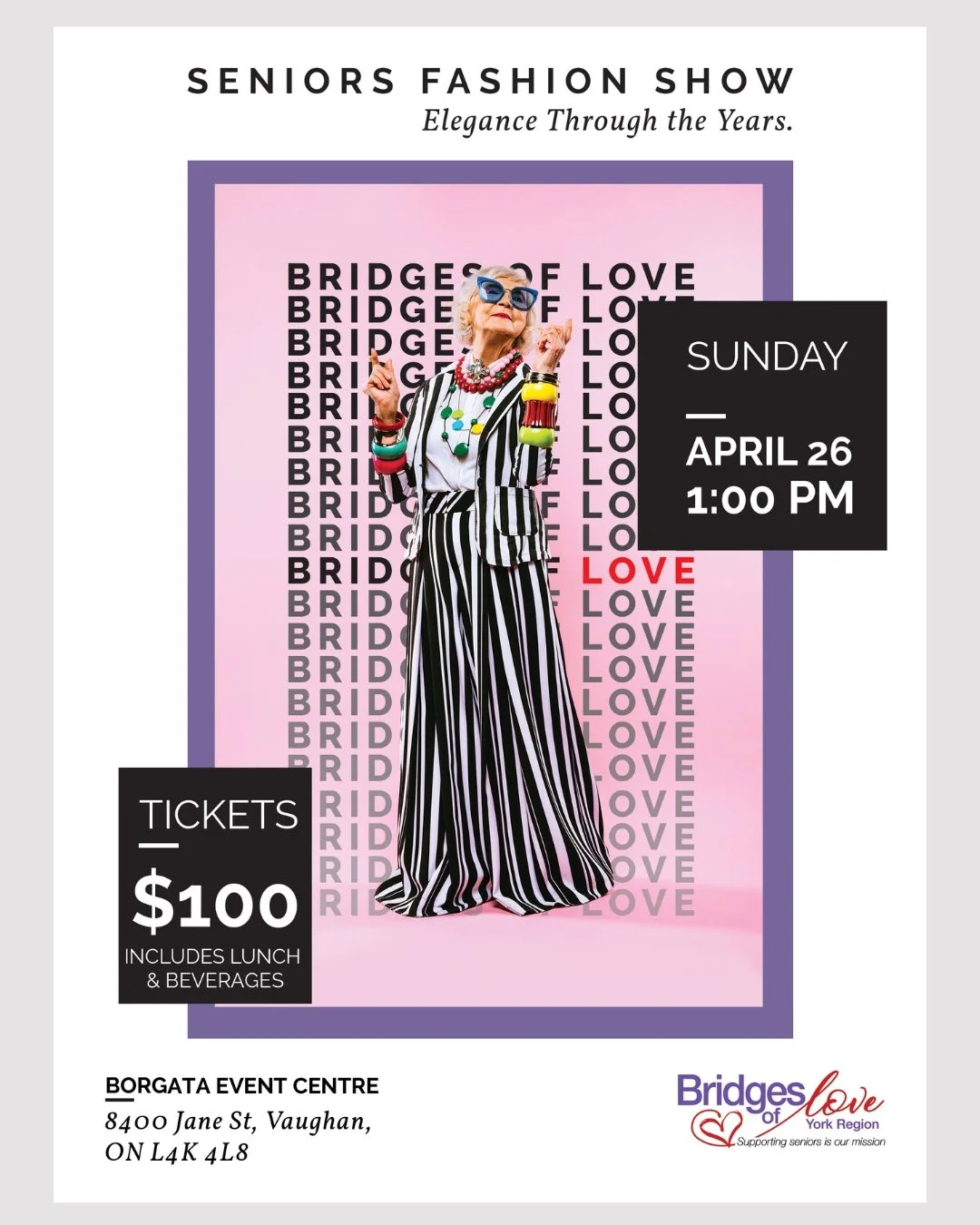 Join us for an inspiring afternoon at Bridges of Love as we celebrate confidence, beauty, and timeless fashion. Our runway will showcase vibrant looks and unforgettable moments, highlighting that elegance truly shines at every age.
